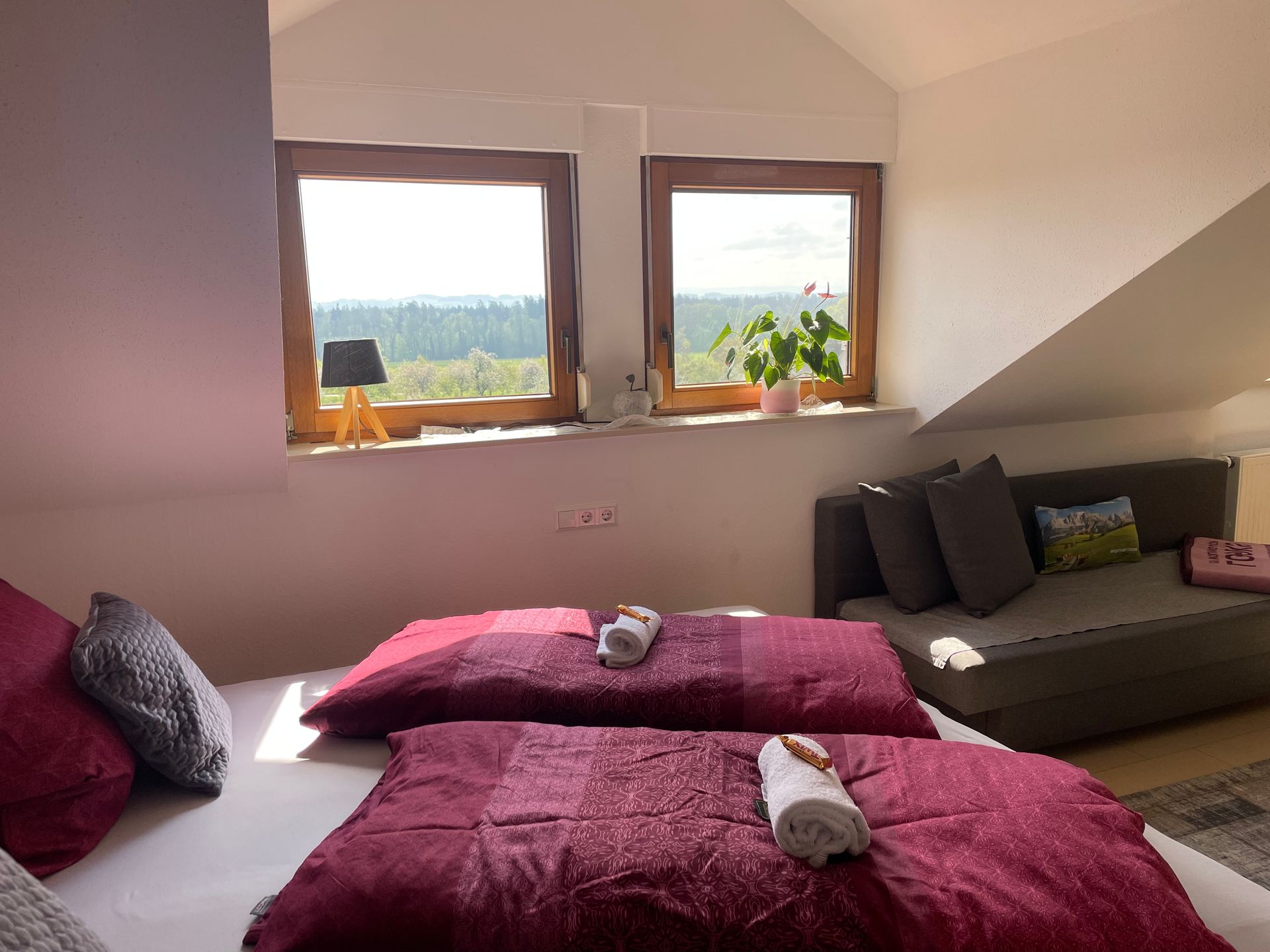 Sie wohnen auf unserem Ferienhof in total ruhiger und idyllischer Lage umgeben von unseren Wäldern, Wiesen und Obstplantagen in Mitten der Natur. Fernab von lauten Straßen, hier hören Sie keinerlei Lärm vom Straßenverkehr. Und trotzdem sind Sie sehr schnell überall von uns aus. Sie nehmen bewusst die Geräusche der Natur wahr. Entspannen sich auf den zahlreichen Naturwegen beim Wandern und Radfahren. Bodensee, Allgäu und Alpen sind zum Greifen nahe. Genießen Sie das einzigartige Alpenpanorama! Unsere freilaufenden Hühner runden das Bauernhof- und Naturpurflair ab. Wir bewirtschaften seit 1898 Landwirtschaft mit Leidenschaft. Verkosten Sie unser naturnah angebautes Obst. Besuchen Sie unsere 20.000 Quadratmeter große Biodiversitätsfläche für sämtliche Pflanzen und Lebewesen ein wertvolles Zuhause. Wir heizen mit Holzhackschnitzeln aus unseren Wäldern, den Strom erzeugen wir selbst auf unseren Dächern, verwenden LED Leuchtmittel und stromsparenden Elektrogeräte, unser Garten wird ausschließlich mit Regenwasser gegossen. Ebenso liegt es uns sehr am Herzen, dass sich unsere Gäste „wie daheim“ fühlen und sich total entspannen können. Wir freuen uns auf Sie! Ihre Familie Gmeinder - Robert, Doris, Andrea und Benedikt- drei Generationen beherbergen Sie mit viel Herzblut.